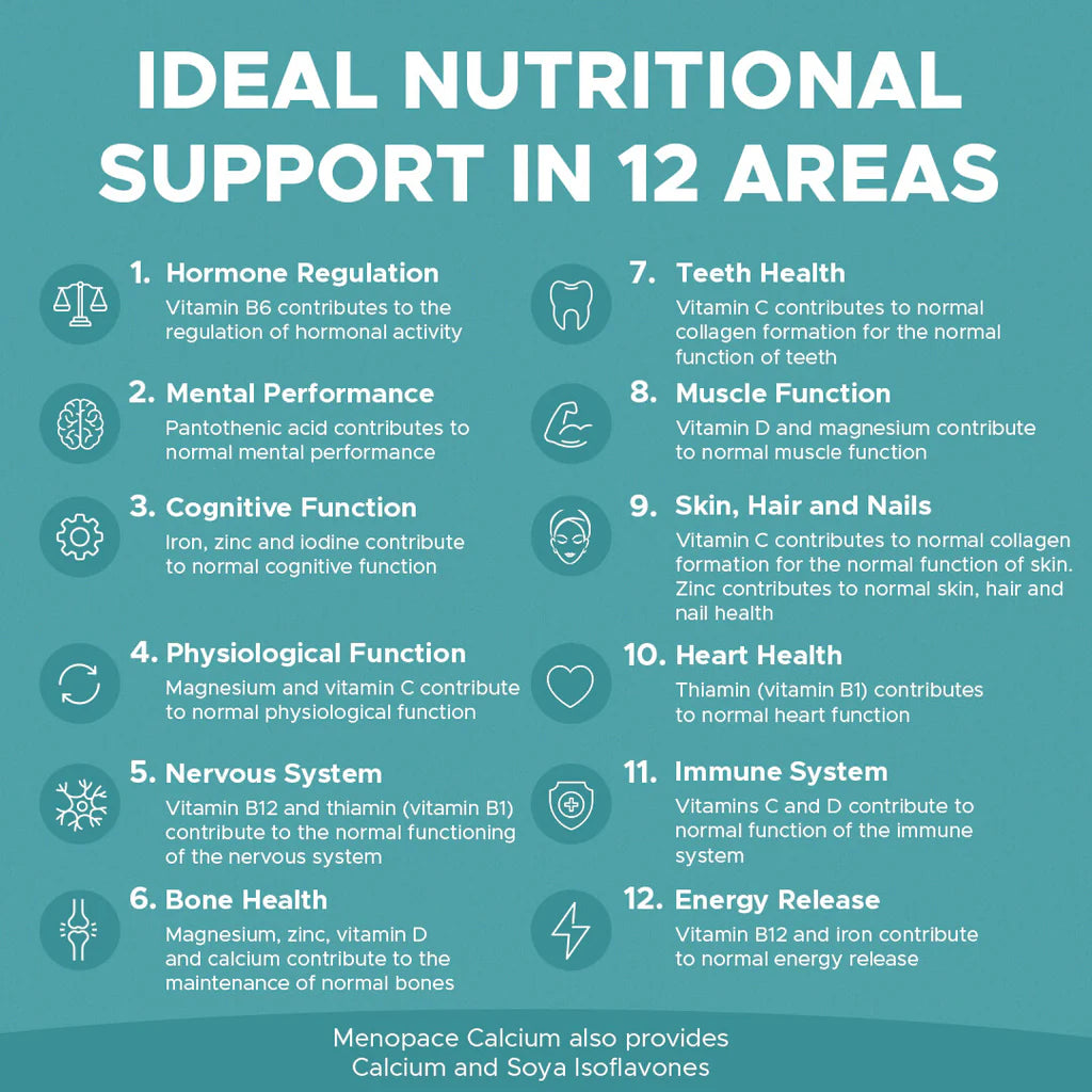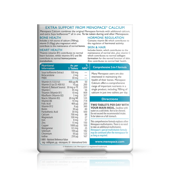 Menopace Calcium is specially formulated to provide advanced support for women, to be taken during perimenopause, and during and after the menopause. It combines the original Menopace formula with added calcium, calcium is needed to help maintain normal bones. The unique formula of 24 nutrients includes vitamin B6 which contributes to the regulation of hormonal activity, as well as 100mg Soya Isoflavones.