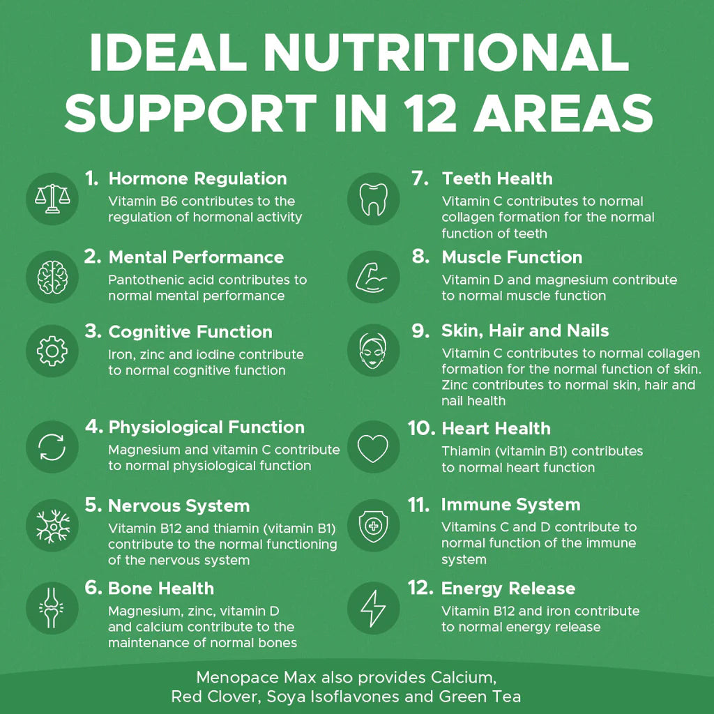 Menopace provides vitamin B12 and thiamin (vitamin B1), which contribute to the normal functioning of the nervous system. The nerves carry messages between your brain and the rest of your body.
