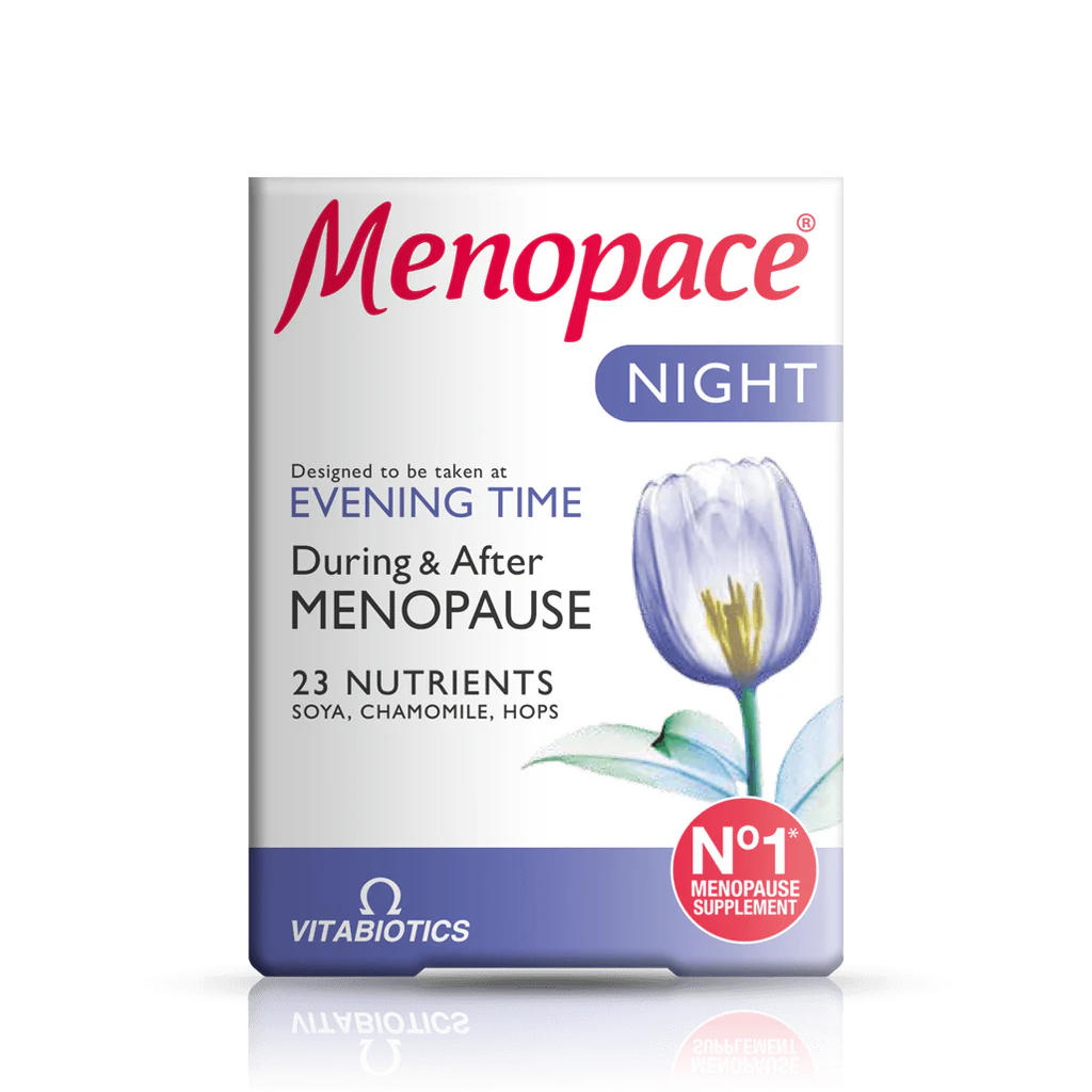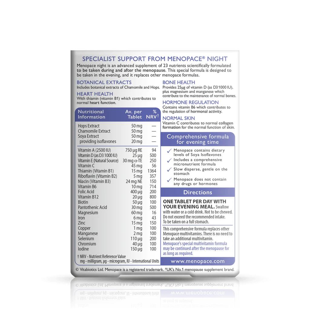 Menopace Night is an advanced supplement of 23 nutrients scientifically formulated to be taken during and after the menopause. The unique micronutrient formula combines all the benefits of the proven original Menopace micronutrient tablet with the additional support of Chamomile and Hops extracts, plus extra Soya Isoflavones from Soya extract. This special formula is designed to be taken in the evening instead of other Menopace formulas.
