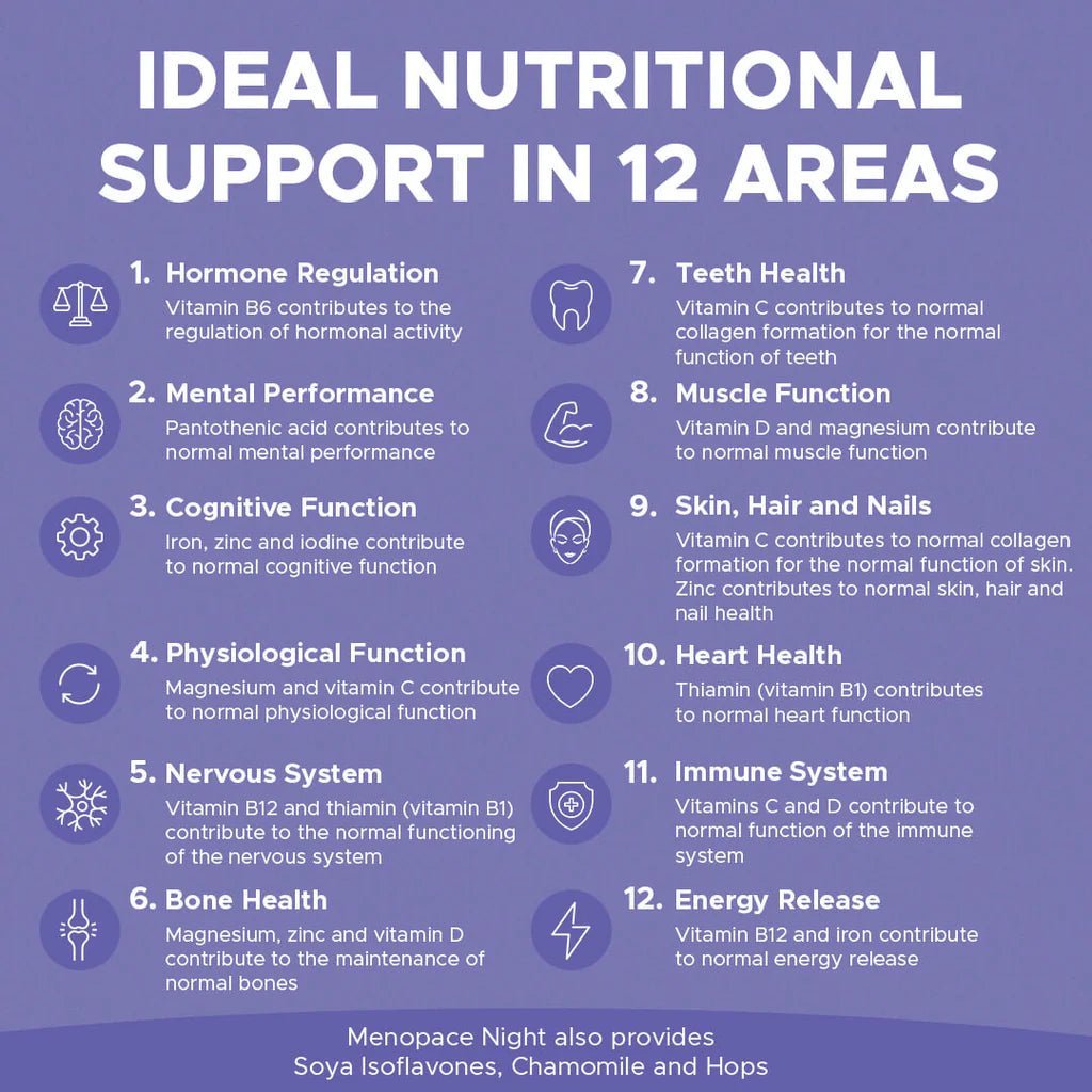 Bone health is particularly important for women during and after the menopause, as bone mass significantly declines. Menopace provides magnesium, zinc and vitamin D which contribute to the maintenance of normal bones. Menopace Night provides 25µg vitamin D. Vitamin D also contributes to the absorption and utilisation of calcium from the diet. Menopace Night can be taken in conjunction with a calcium supplement such as Osteocare.