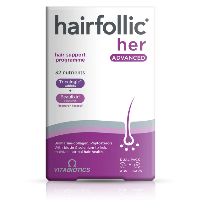 Hairfollic Her Advanced est un pack double contenant Tricologic ® comprimés et capsules Beaulixir ® avec une combinaison équilibrée de vitamines, de minéraux et de nutriments bioactifs formulés par les experts de Vitabiotics, notamment du sélénium et du zinc qui contribuent à des cheveux normaux, ainsi que du collagène marin hydrolysé, de l'extrait de pépins de raisin et des acides aminés.