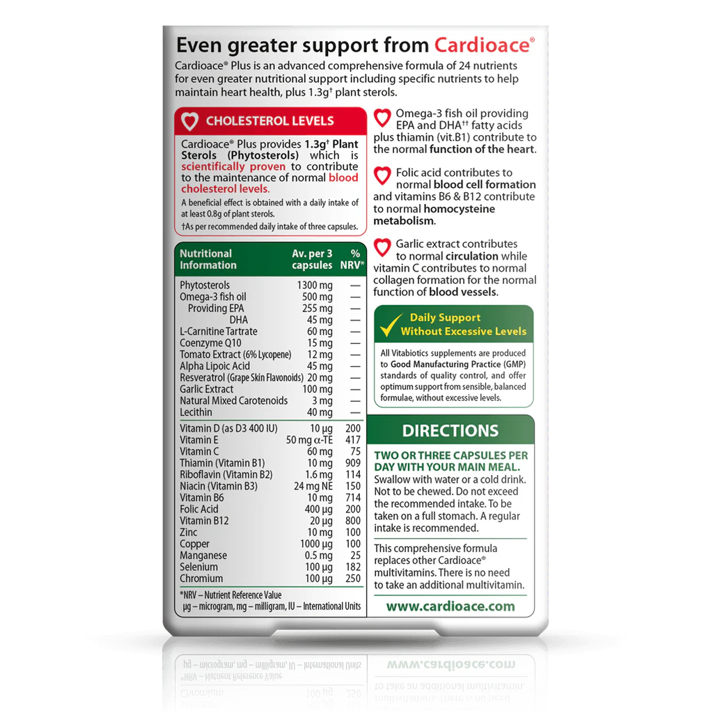 Cardioace Plus associe la formule multinutritionnelle complète du Cardioace original à 1,3 g de stérols végétaux et au Cardiol, un complexe botanique exclusif contenant du lycopène de tomate, de l'ALA (acide alpha-lipoïque) et du resvératrol (flavonoïdes de peau de raisin rouge). Conçu pour être le complément nutritionnel le plus complet et basé sur la recherche, il contient des nutriments spécifiques comme la thiamine (vitamine B1), qui contribue au bon fonctionnement du cœur. La formule Cardioace Plus contribue à préserver les niveaux de nutriments essentiels à la santé cardiaque et au maintien d'un taux de cholestérol normal. Développé grâce à la technologie Licaps haut de gamme, il garantit stabilité et performance.