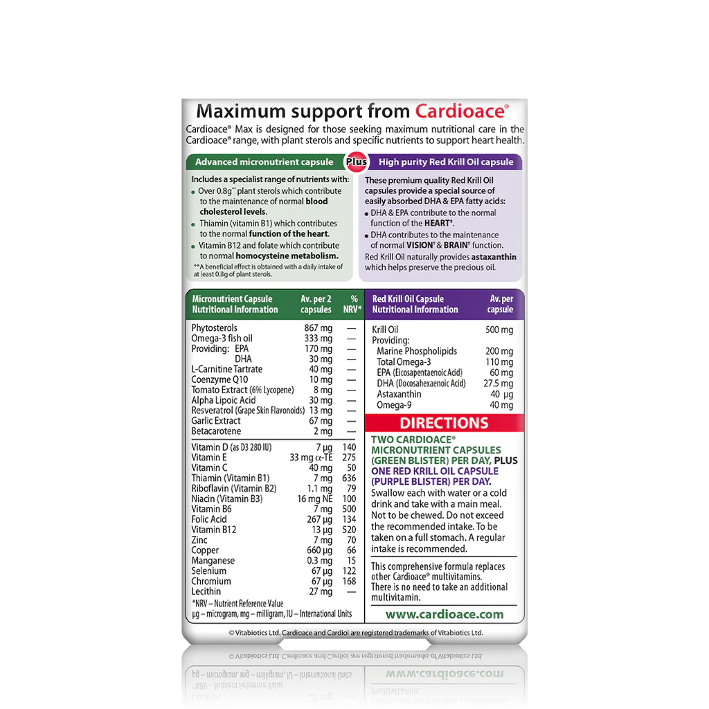 Cardioace Max est une formule avancée à double capsule conçue pour ceux qui recherchent un soin nutritionnel maximal dans la gamme Cardioace, avec des stérols végétaux et des nutriments spécifiques pour soutenir la santé cardiaque.