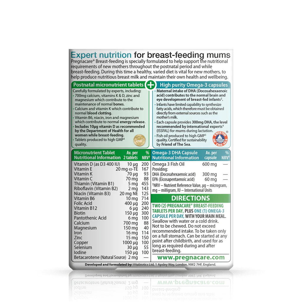 Pregnacare Allaitement peut également être pris comme complément postnatal général pendant 6 à 9 mois après l'accouchement ou plus longtemps si nécessaire, pour remplacer les nutriments épuisés et aider le corps après la grossesse, même si vous n'allaitez pas.
