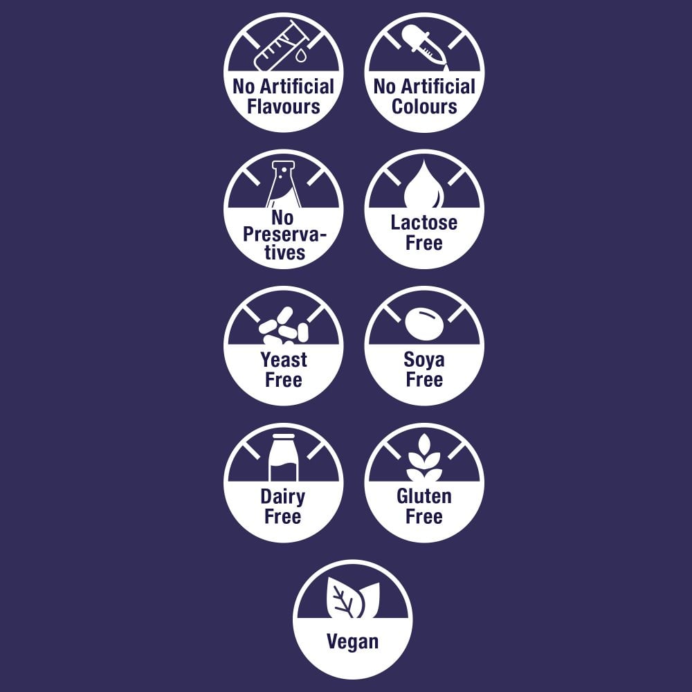 Informations sur les allergies Convient aux végétariens et aux végétaliens. SANS : OGM, colorants artificiels, arômes artificiels, lactose, produits laitiers, gluten, blé, levure, noix, sel, soja, amidon et sucre.