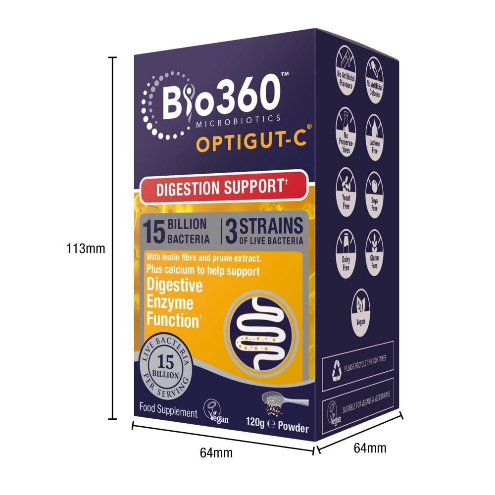 Ce complément microbiologique végétalien est une poudre au goût agréable, à consommer directement ou à mélanger à une boisson ou un aliment froid. Fabriqué selon les normes les plus strictes, OptiGUT-C est exempt de gluten, de blé, de levure, de produits laitiers, de fruits à coque et de sel. Mieux encore, OptiGUT-C ne nécessite aucune réfrigération.