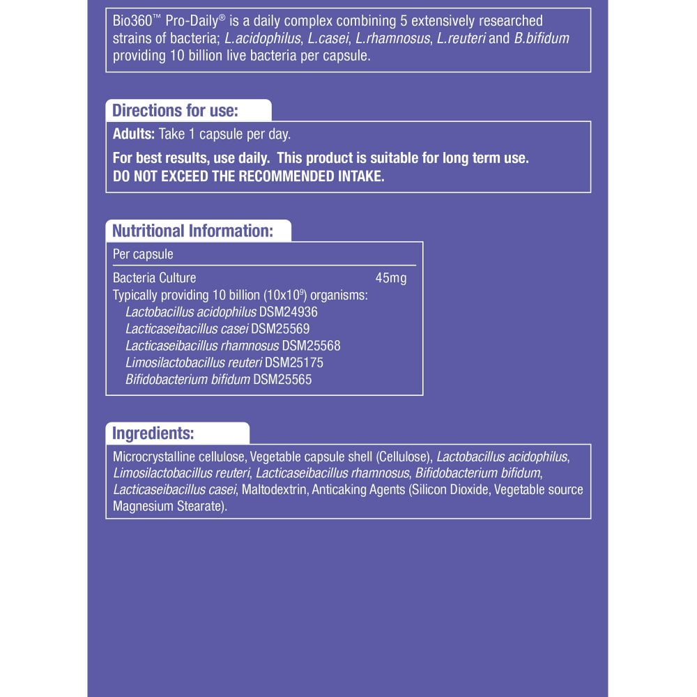 Chaque capsule de Pro-Daily, facile à avaler, apporte 10 milliards de bonnes bactéries, constituant ainsi un complément quotidien multi-souches pratique. Pro-Daily constitue une introduction idéale aux compléments à base de bactéries et ne nécessite aucune réfrigération.