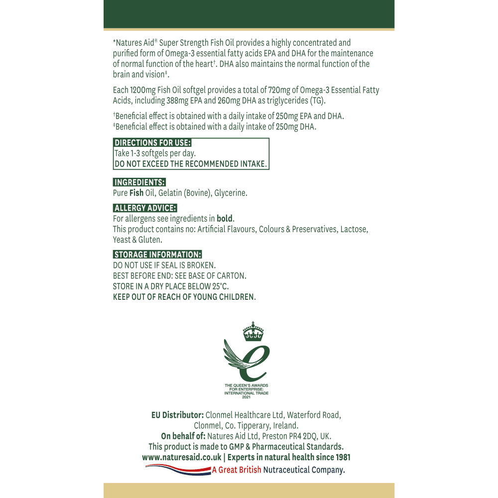 Chaque gel mou d'huile de poisson de 1200 mg fournit un total de 720 mg d'acides gras essentiels oméga-3, dont 388 mg d'EPA et 260 mg de DHA (sous forme de triglycérides).