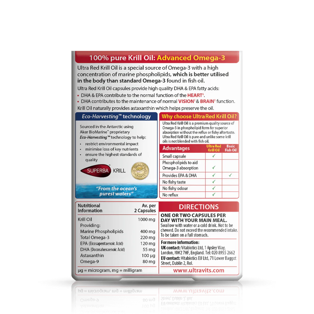 L'huile de krill Ultra Red prend la forme de phospholipides oméga-3, plutôt que la forme de triglycérides oméga-3 présente dans les huiles de poisson et de foie de morue.