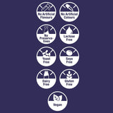 | Allergy Information | Suitable for vegetarians and vegans. FREE FROM: GMO, artificial colours, artificial flavours, dairy, lactose, gluten, wheat, yeast, nuts, salt, soya, starch and sugar. |